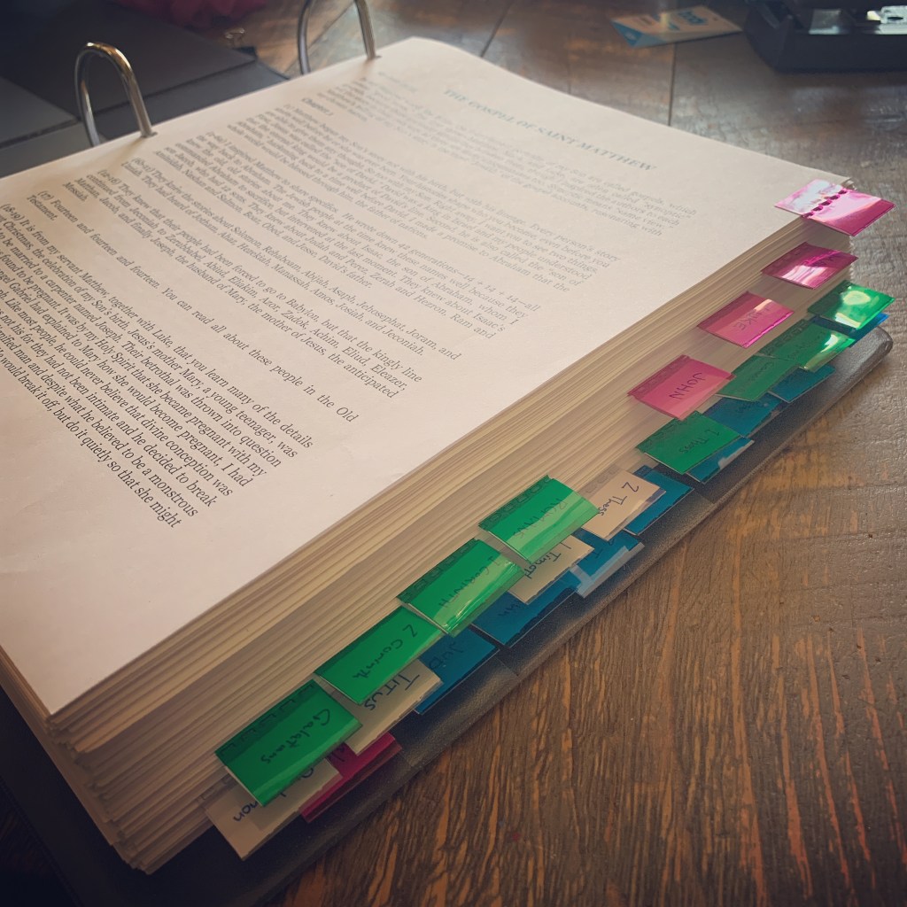 It’s getting so close. Only two tabs missing—Acts and 2 Timothy, which will probably take a couple of months. And then editing. #amwriting #bible #relationaltheology